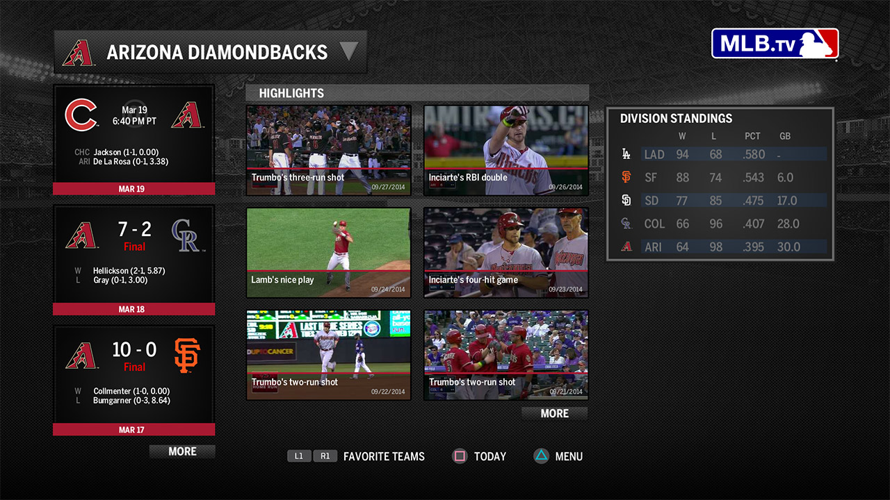 Watch every regular and postseason MLB® game LIVE or on demand in HD quality. Additional features include DVR functionality, clickable linescore, milestone markers, home and away feeds, and player and team stats.
